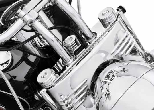 Gekrönt mit dem eindrucksvollen Bar & Shield Logo, zaubern diese polierten, dreifach verchromten Abdeckungen einen glänzenden Blickfang auf das obere Gabelende.
