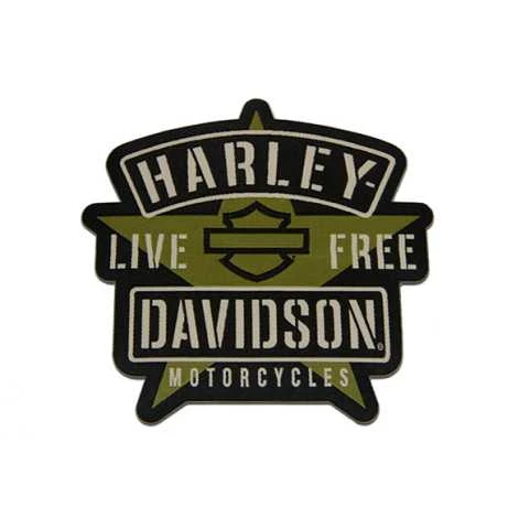 Original Harley-Davidson Aufnäher. Hochwertige gewebte, militärisch inspirierte Schrift- und Sterngrafik auf dem Aufnäher. Stabiler schwarzer gewebter Hintergrund, der jeder Fahrt standhält. Aufnähbarer Aufnäher. Toll aussehender Aufnäher zum Aufnähen auf Ihre Weste oder Jacke.