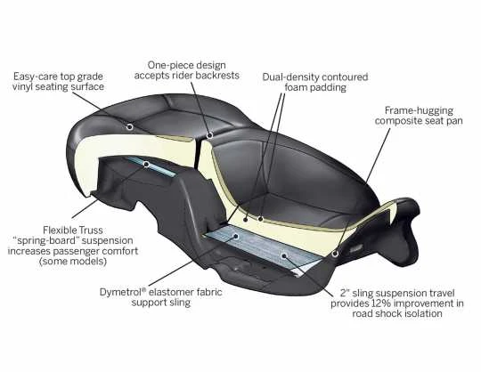 - Für den Sozius erbringt das mehrlagige, Sprungbrettartige Federungssystem zusammen mit ca. zwei Zoll herkömmlichen Schaums eine Komfortverbesserung von 15 %