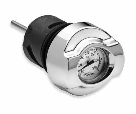 Tauschen Sie den Original-Ölmessstab gegen diese Version im Custom-Styling aus, die über eine einfach abzulesende, mechanische Temperaturanzeige mit „Harley-Davidson“ Logo verfügt.